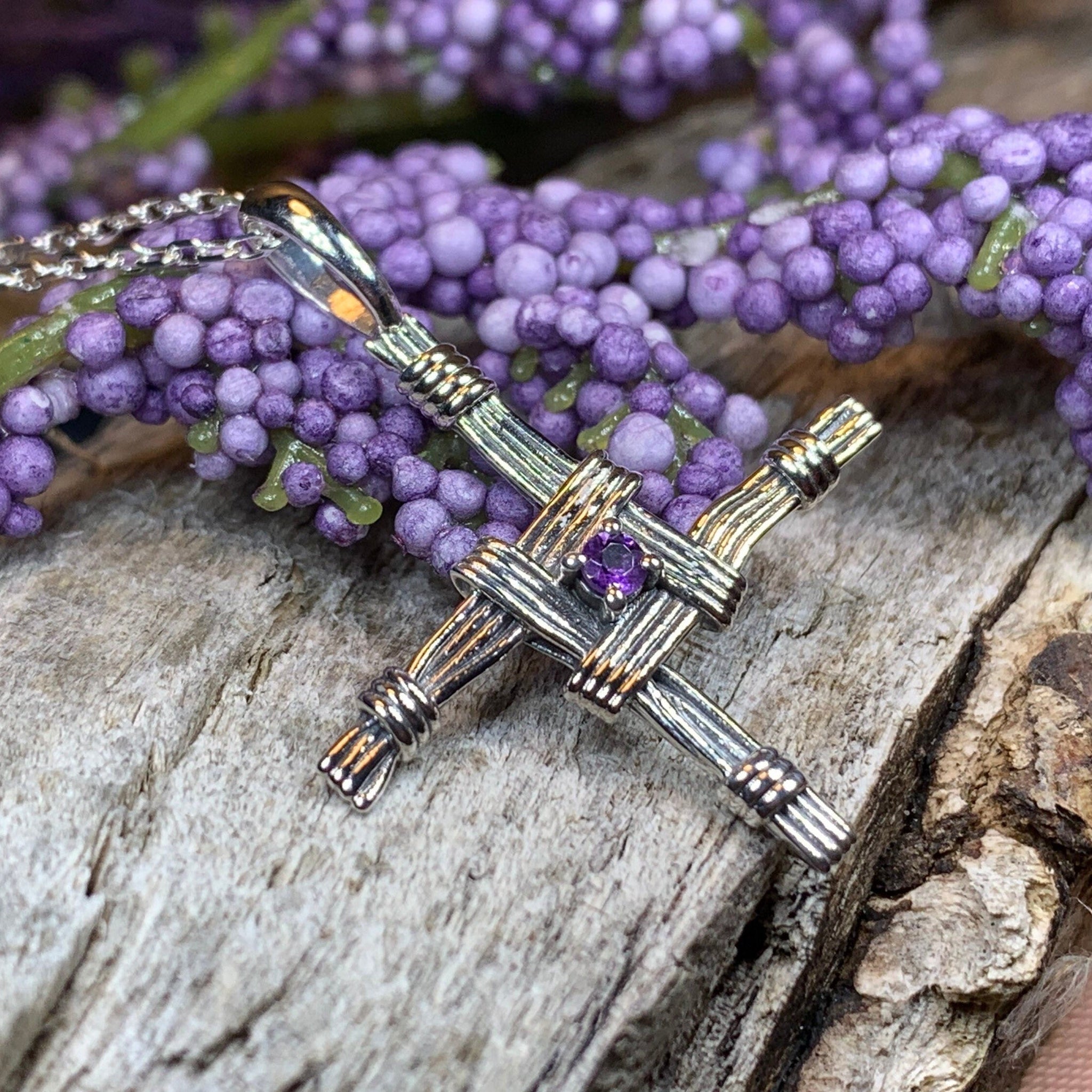 This attractive Saint Bridget's cross has detailing on the front and a faceted gemstone of your choice: diamond cubic zirconia, authentic garnet, authentic amethyst, emerald cubic zirconia or authentic rainbow moonstone.