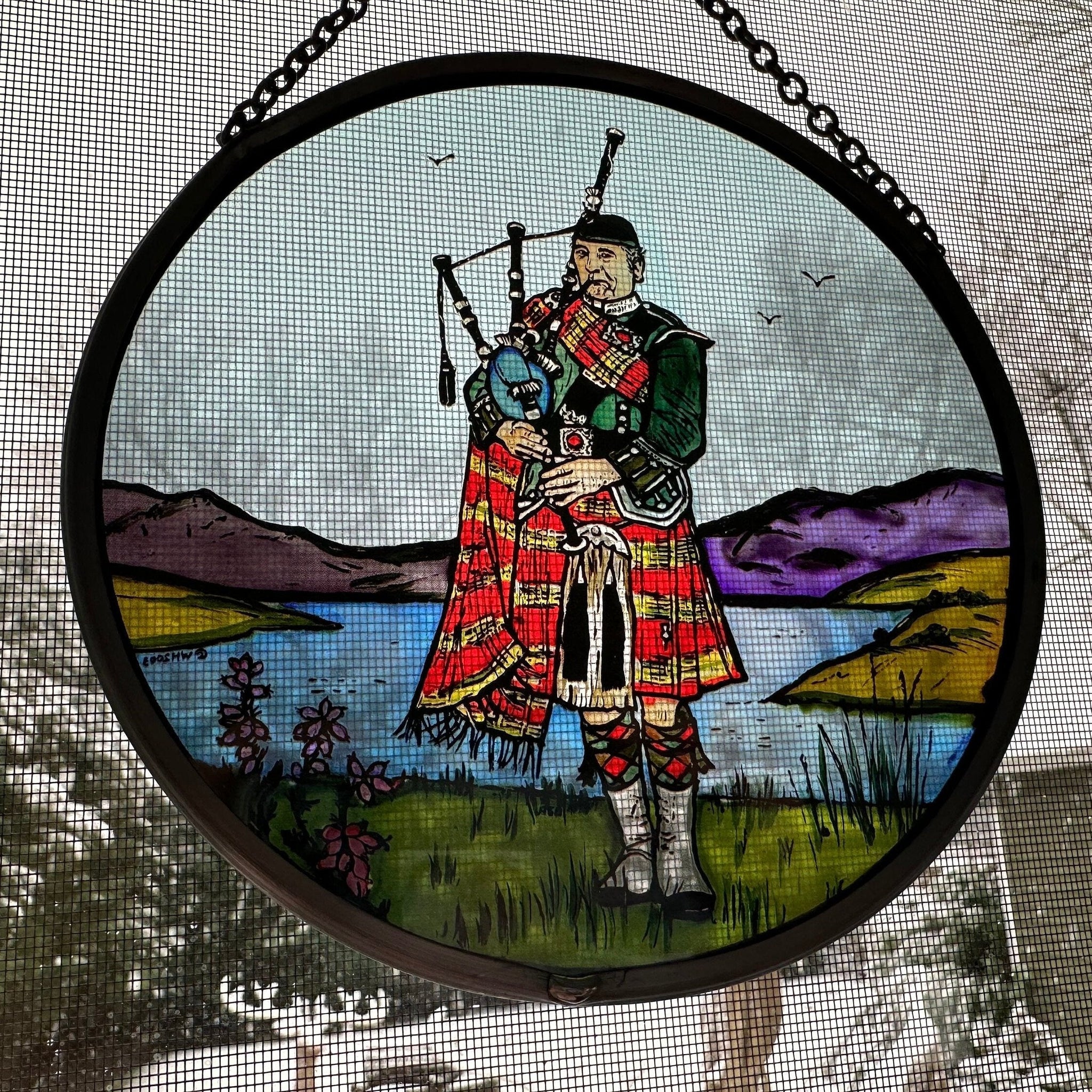 This Celtic Bagpiper window art glows in the beautiful colors of the Scottish Highlands. If you have ever seen the proud bagpiper standing in the Scottish Highlands and filling the air with the glorious sound of the pipes you will never forget it! Bring that beautiful memory back with this lovely scene in handpainted glass.